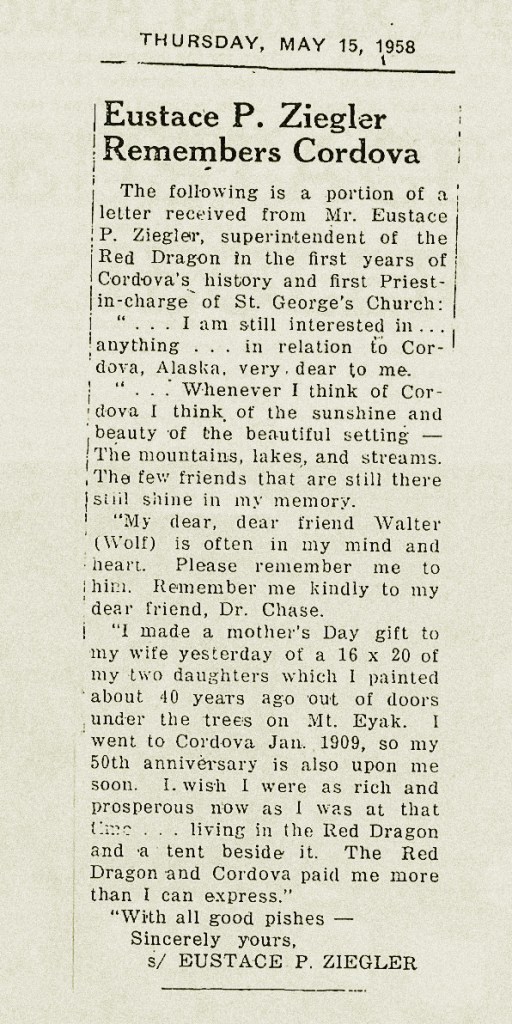 In 1959, Ziegler sent a heartfelt letter to The Cordova Times (see below), expressing his love of Cordova and appreciation for his time working at the Red Dragon and St. George’s: “… I wish I were as rich and prosperous now as I was at that time. . . living in the Red Dragon and a tent beside it. The Red Dragon and Cordova paid me more than I can express.”
